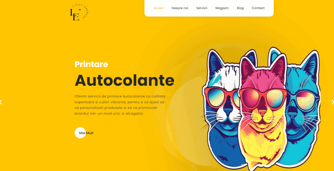 Integrare magazin online: Am adăugat un magazin online pentru a facilita accesul clienților la produsele și serviciile Light Engrave, inclusiv articole gravate personalizate, autocolante și materiale de promovare.